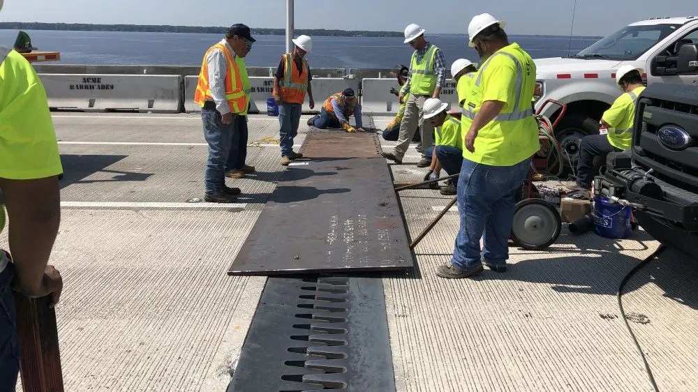 Workers remove temporary plates from a damaged finger joint during repair in May 2021. | Florida Department of Transportation