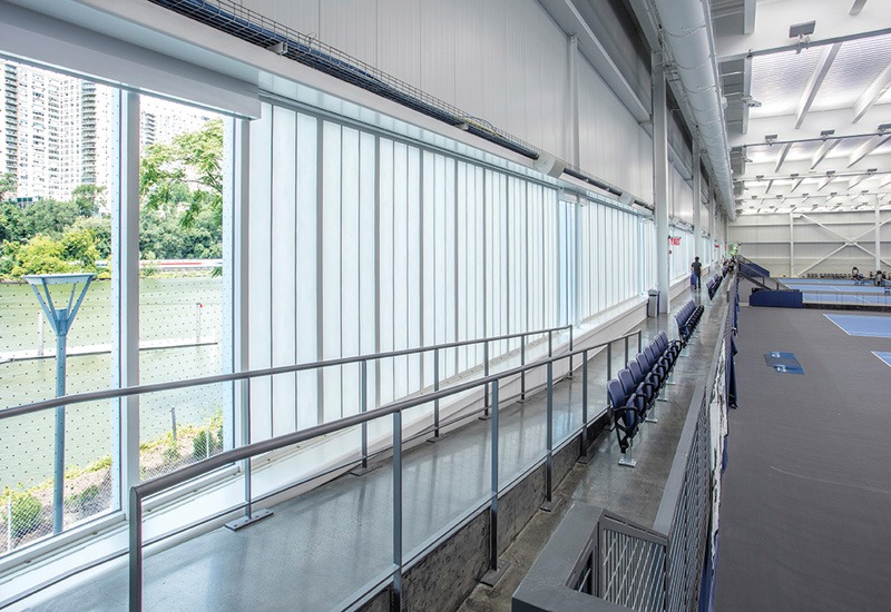 Building on this evidence, the Milstein Center incorporates translucent curtain wall systems that diffuse daylight evenly across the indoor courts. By minimizing glare and reducing localized hotspots, the assemblies provide consistent illumination that enhances visual comfort during play while allowing athletes to maintain focus without distraction.8 Tennis was created as an outdoor sport, and the athletes at the Milstein Center continue to reap the intended benefits of playing this outdoor sport.