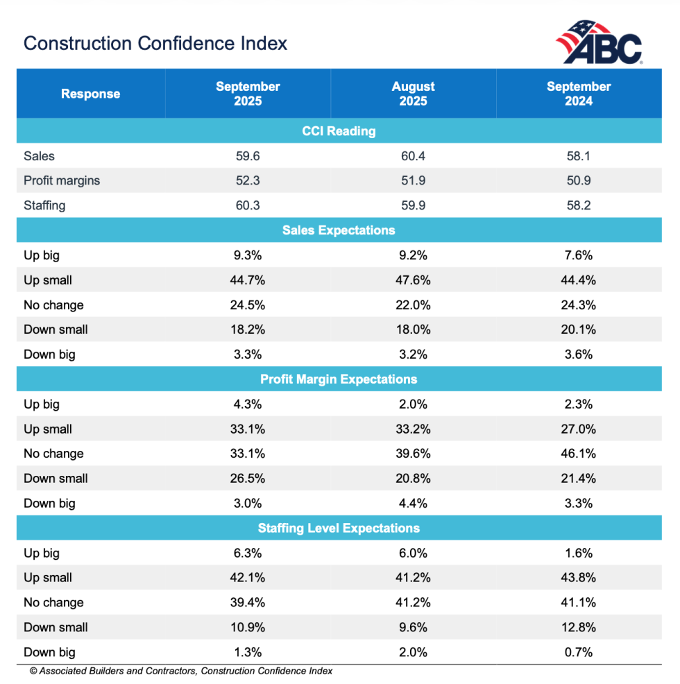 Despite uncertainty and concerning economic data, ABC’s Construction Backlog Indicator was unchanged at 8.5 months in September. While contractor confidence has declined slightly over the past few months, expectations for sales, profit margin, and hiring all remain positive and above year-ago levels.