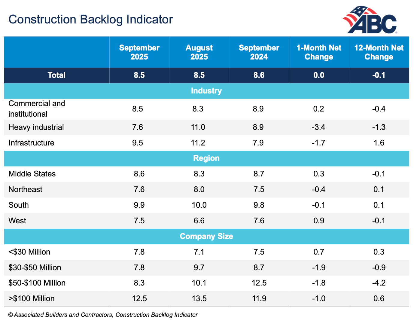 - Construction backlog held at 8.5 months in September, unchanged from August, according to an Associated Builders and Contractors survey conducted Sept. 22 to Oct. 6.