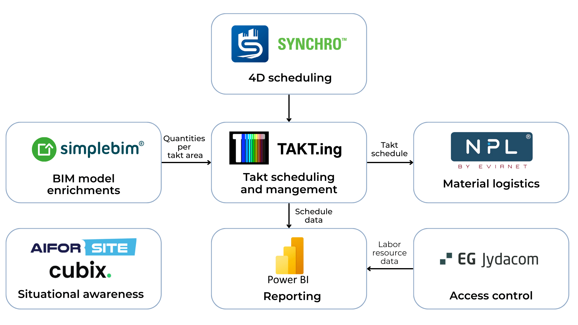 Quantities derived from the enriched models feed directly into TAKT.ing, the takt scheduling and management software. This ensures every work package is tied to accurate, model-based quantities and locations.