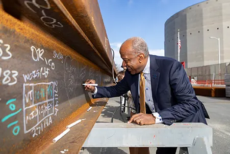 Stakeholders in the project gathered to sign the beam in the common tradition before its ceremonial placement as a celebration of the milestone. UC Davis Health expects to open the California Tower in 2030.