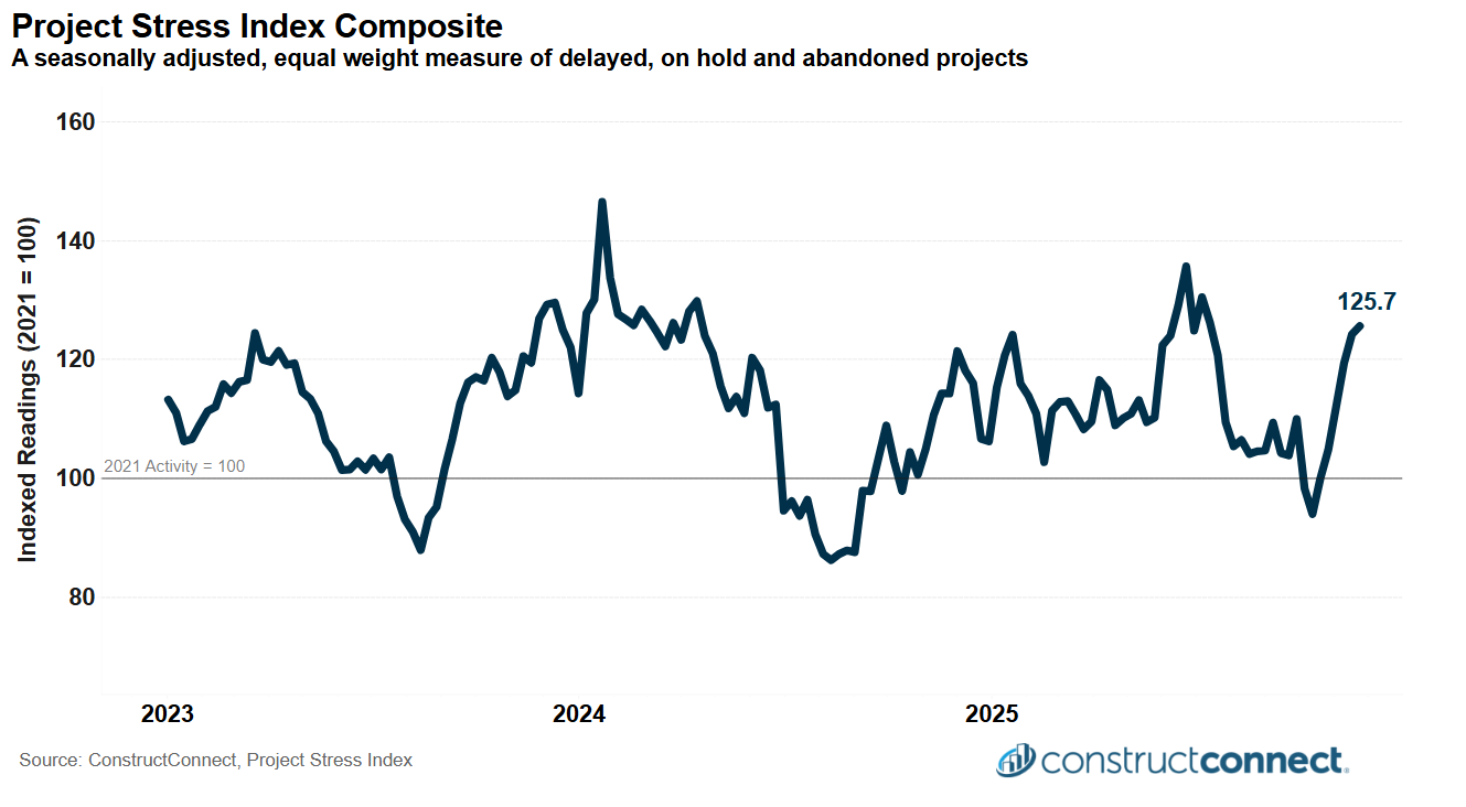 The Project Stress Index, a measure of construction projects that have been delayed or abandoned, jumped 19.9% from October to November. The increase pushes the benchmark about 25.7% above its 2021 baseline, said Devin Bell, associate economist at ConstructConnect.