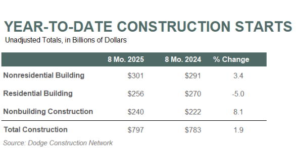Residential building starts increased 2.4% in August due to a strong 15.5% growth in multifamily starts during the month, according to Dodge. For the 12 months ending August 2025, total residential starts fell 1.2%.