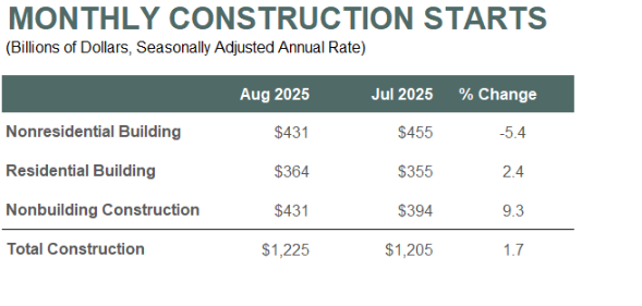 For the 12 months ending August 2025, total nonresidential starts were up 4.8%, with the commercial and institutional categories up 17.4% and 6.1%, respectively.